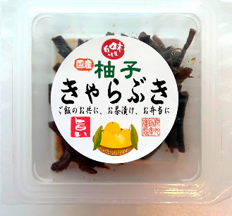 甘辛いきゃらぶきの佃煮に、甘露煮にした国産の柚子皮を加えて仕上げました。