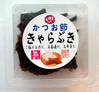 たっぷりのかつお節を加えて仕上げた、甘辛いきゃらぶきの佃煮です。